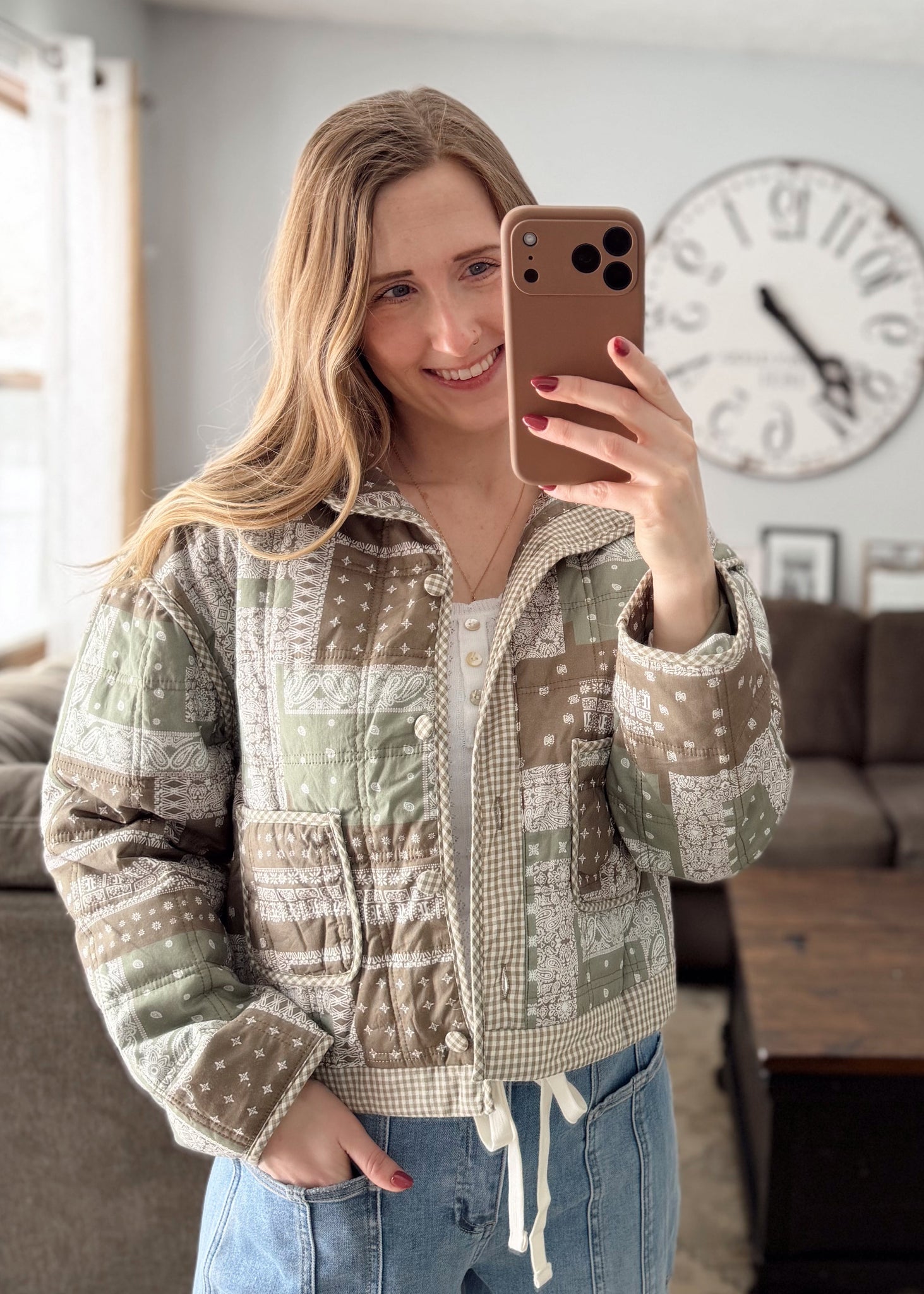 Make a bold statement with the Paisley Patchwork Jacket, a thoughtfully designed piece that combines texture and style. The quilted bandana patchwork creates visual interest, while the structured stand collar and button-down front offer timeless appeal. Designed with drop shoulder sleeves for a modern, comfortable fit, this jacket features charming contrast gingham binding that adds personality to every detail. Functional front patch pockets provide practical storage, and the lined construction delivers warmth and durability.